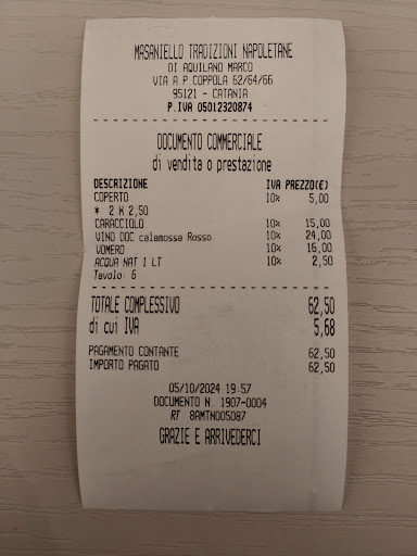 Read moreHoy, para despedirnos de Catania y proseguir viaje alrededor de Sicilia, decidimos cenar en uno de sus numerosos restaurantes. Elegimos éste, que tiene platos típicos de Nápoles casi por casualidad, en el tour por la ciudad nos llamó la atención y hablamos de comer o cenar si se daba la situación. Acudimos pronto, debían ser sobre las siete de la tarde, y tuvimos suerte porque tenían mesas libres, ya que suponemos que por ser sábado estaba casi todo reservado. Nos trajeron una carta traducida al español, lo que nos facilitó mucho la tarea de elegír los platos. Fue un entrante y una pizza, junto con una botella de agua y una botella de vino de la casa de uva sirah que nos recomendaron puesto que en un principio habíamos elegido una frizzante. El entrante estuvo superior, se llama caracciolo, con jamón, tomates, rúcula y burrata, casi de inmediato nos trajeron un plato que contenía una masa similar a una base de pizza y que se debería haber comido a la vez que el entrante, nosotros la verdad es que más bien nos la comimos entera casi al final. Luego vino la pizza, pedimos una de las especiales, que se llama vomero y que junto al resto pongo en la nota de pago. La atención de todo el personal fue magnífica, en todo momento preguntando si iba todo bien, si nos gustó. Nos hubiera gustado tomar también un postre tradicional que había en la carta, pero no estamos acostumbrados a cenar tanto y preferimos, con gran pesar, no pedirlo. Recomiendo venir aquí y disfrutar de este sitio, si es posible reservar porque igual no hay tanta suerte como la nuestra. La cortesía, la atención y el esmero con el que tratan a la gente que se acerca aquí sin duda les...