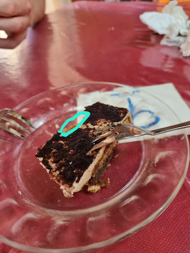 Despite the seemingly affordable prices, it’s not worth it at all. The food we were served was overcooked and lacked flavor, but the worst part was the tiramisu—it was ridiculously tiny ( the blue-marked part in the photo is where we already took a bite). Worse, It tasted like it had been sitting in the fridge for far too long.