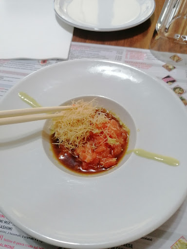 Non aspettatevi tutta l'eleganza dei classici all you can eat... è stile trattoria all'italiana, tavoli in legno con seggiole (le chiamo così quelle stile retró), tovaglietta che fa anche da menù. Anche l'ordinazione è molto alla buona, un foglio di un block-notes e via. A parte tutto questo preambolo devo dire che si mangia davvero bene, pesce fresco, porzioni anche più abbondanti di altri posti del genere, mi è piaciuto tantissimo il riso che è alla base di ogni preparazione di questi ristoranti. Cotto il giusto, compatto e non colloso. Io hopreferito sashimi, uramaki, onigiri e temaki, con pesce crudo gli ultimi e li ho trovati deliziosi, l'alga nori era sempre croccante. Mio marito va sempre sul 'cucinato' tipo riso alla cantonese, udon con verdure e carne e nonostante la sua perplessità all'inizio si è ricreduto alla grande e non disdegna di tornarci.
