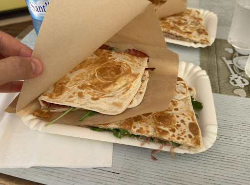 Read moreLa prima foto parla da sola: queste piadine sono enormi, l'impasto è davvero buono, si sente lo strutto e il latte. La farcitura è tantissima! Hanno tagliato il prosciutto al momento per fare una delle nostre piadine, e il tutto ha richiesto solo due minuti! Le abbiamo prese a portare via, e ce le hanno date in ina busta di carta marrone per tenerla in mano, su un vassoio, con due tovaglioli, il tutto in una busta di carta. I proprietari sono gentili e simpatici. Ho recensito un altra piadineria oggi, ma non c'è proprio paragone.... Sicuramente quando tornerò a cattolica questo sarà la...