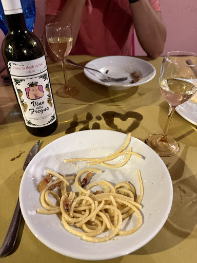 We found this little restaurant because it was close to our hotel. We sat upstairs in the eclectically decorated dining room, surrounded by guitars and music memorabilia. After ready some other reviews, it’s easy to see that the owner was in the music industry. Through broken communication we found out that he’s owned the restaurant for 16 years. He made a very tasty dinner (carbonara pasta, and pork ribs in beer), and we stood at the bar with him afterwards as he gave us a couple digestivo shots. We would recommend checking this little place out if...