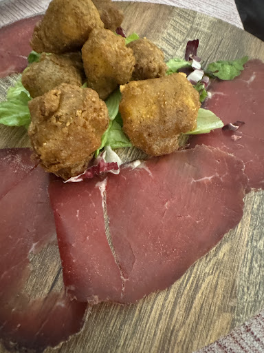 Antipasto: Ho provato gli sciatt per la prima volta e li ho trovati molto buoni, anche se non ho termini di paragone con altri. Erano accompagnati da bresaola di media qualità. Ho gradito del miele, da me richiesto, per aggiungere un tocco di contrasto. Il vero problema è il prezzo: 15€ è davvero troppo, considerando che solitamente si trovano tra i 7 e i 10€.