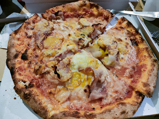 Si tratta principalmente di una pizzeria d’asporto che dispone di qualche tavolo di fronte al bancone dove si può bere qualcosa nell’attesa della propria pizza. Gli ingredienti sono sempre freschi e di ottima qualità e le pizze di grandi dimensioni. La farina usata in questa pizzeria è di semola e son spesso disponibili anche vari impasti integrali (a seconda della disponibilità). Raccomando di dare uno sguardo alla grande lavagna di fianco al bancone delle pizze dove il pizzaiolo segna le pizze fuori menù della settimana, con gli ingredienti stagionali. È possibile mangiare anche dell’ottima carne cotta alla griglia su carbone e incredibili insalate preparate sul momento. I prezzi sono bassi-nella norma, ma le pizze sono molto più grandi rispetto a quelle dei loro colleghi. Dispongono anche di ottima mozzarella per intolleranti al lattosio che non fa rimpiangere “la...