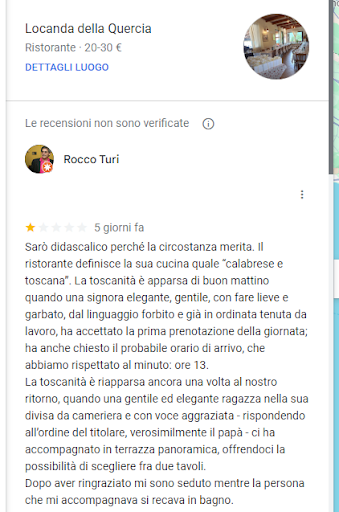 Relativamente ai piatti gustati, avevo recensito questo locale in maniera abbastanza positiva. Il giudizio negativo era rivolto al cameriere, socio e proprietario il quale, a mio parere, svolgeva il suo compito in maniera difforme dal suo ruolo, in tenuta da spiaggia e poco educato. Tuttavia, ho appena letto la “Risposta”, data non già dal cameriere-proprietario a cui era rivolta la mia critica ma dalla socia, nonché moglie. Per replicare - e per mancanza di spazio - sono costretto ad eliminare i particolari che avevo spiegato in un lungo e circostanziato testo (ma opportunamente “salvato” in uno screenshot). Come si può leggere nella sua “Risposta” anche fuori tema, anziché spiegare, la proprietaria attacca usando locuzioni del tipo “il suo più grande errore”, “la banalità del suo giudizio”, “una grande frustrazione e risentimento”, con il caritatevole augurio finale, a me rivolto, di riuscire a “vedere e apprezzare le cose importanti per non perdersi il gusto dell’essenza della vita”. Evitando di affrontare l’oggetto della mia critica, dall’intervento della signora si deduce medesima SPOCCHIA dimostrata dal marito anche nei confronti di altri clienti, i quali confermano: “Grande maleducazione (FM)”; “Non ci ritorneremo più: proprietario invadente e inopportuno, convinto e saccente… Sottolineo la supponenza del proprietario. Di certo non ci tornerò più (MS)”; “Proprietario arrogante e poco cordiale (MM)”. Esattamente così. Tuttavia, cosa simpatica in quest’ultima recensione è che la proprietaria abbia, fra l’altro, scritto: “Sono sicura che non abbia avuto modo di interfacciarsi col proprietario”. Due pesi, due misure. Fatto sta che la dott.ssa, così come ha prefissato il suo nome nell’ultima recensione qui indicata, non è entrata nel merito della mia onesta critica, per la quale mi sarei aspettato una risposta decisamente più sobria ed elegante. Vero è che la proprietaria non ha compreso il senso della dicotomia Toscana-Calabria; ma diciamoci la verità, non stona l’originale divisa in short da mare indossata da suo marito in quel contesto montano? A mio parere è questione di etica e rispetto verso tutti i clienti, che qualche soggetto come suo marito corregge (la questione di etica) con atteggiamento da compagnone per apparire simpatico, sempre che (a condizione di) - come dice la signora - il cliente si sia preventivamente “interfacciato” col proprietario. Ma c’è cliente e cliente; e c’è chi entra in un ristorante solo per mangiare e non per interpretare il modo in cui sia preventivamente “utile e vantaggioso” interfacciarsi col cameriere. Se la signora fosse stata una mia studentessa avrei avuto difficoltà di giudizio se promuoverla con un 18-20 per come abbia cucinato o bocciarla per essere uscita fuori tema, per non aver risposto alla gentile contestazione sull’abbigliamento a nome del marito e per come non abbia saputo difenderlo adeguatamente, tutta protesa nella personale veemenza di scegliere con poco garbo e gusto gli aggettivi e le locuzioni peggiori usate nei miei confronti. Orsù dottoressa, arrivederci alla prossima occasione con una stretta di mano.