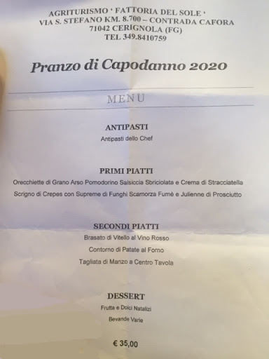 Read moreDopo il pranzo di Natale fatto a Trani con menù prettamente a base di prodotti del mare, abbiamo deciso in famiglia di restare ed assaporare i prodotti del nostro territorio per il pranzo di Capodanno. Il menù proposto, al di là costo veramente invitante, ci ha convinti appieno. Ottimi ed abbondanti gli antipasti, deliziosi i due primi e i due secondi e squisiti i dolci caserecci natalizi, tipici Cerignolani, di cui abbiamo richiesto e ottenuto gentilmente il bis. Naturalmente il tutto accompagnato da una macedonia di frutta, da caffè ed amari digestivi che faticosamente siamo riusciti ad assaporare vista la sensazione di sazietà che ci accompagnava ormai già dai secondi!!!! Che dire, sicuramente rifaremo una capatina al più presto presso l’Agriturismo Fattoria Del Sole , che nulla ha da invidiare ai migliori ristoranti del...