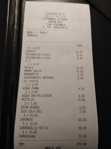 Read moreRistorante-pizzeria situato in uno dei viali più belli della città, ubicato all'interno di locali storici dei conti Pavoncelli. Si possono consumare deliziosi pasti, preparati da personale esperto, sia all'interno che all'esterno sul bel viale alberato di Via Pavoncelli, dove si può godere di un'ottima vista del Piano San Rocco con le Fosse Granarie e la Chiesa di San Domenico, nonchè del Palazzo Pavoncelli. Il menù è vario e comprende, ovviamente, oltre alla ottima cucina locale, anche ottime pizze di ogni genere, dove spicca la pizza "cerignolana", senza nulla togliere alle altre pizze. Qui si possono degustare gli ottimi vini locali (soprattutto), vini nazionali ed anche esteri (tanto la maggior parte di questi viene prodotto con i mosti cerignolani!), del resto Mistella prende proprio il nome dal mosto d'uva non o parzialmente fermentato, storicamente lavorato in questi locali che, miscelato con acquavite di vino o alcol, veniva (viene) usato per la preparazione di vini liquorosi, aperitivi ed altri combinati. Ottimo cibo, personale gentilissimo e preparato. Qui ci si immerge nella vera buona essenza di Cerignola. Adatto e...