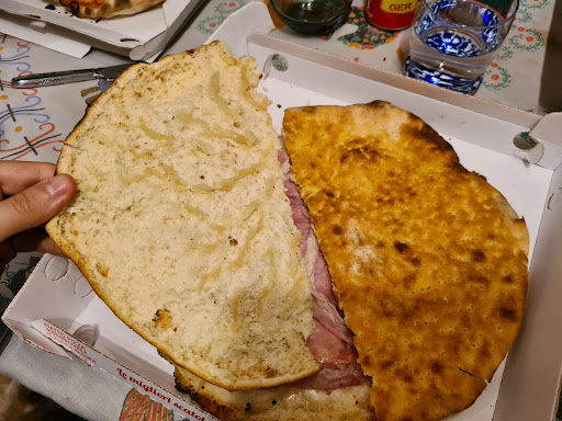 Non do mai brutte recensioni salvo proprio casi eccezionali, e questo è proprio uno di quelli. Ho ordinato 4 pizze, di cui una ripiena. Ora io voglio dire: questa in foto può essere chiamata pizza? Può essere chiamata focaccia ripiena? Non c'è un minimo di vergogna a servire una cosa così? Completamente secca, il "piano" di sopra staccato dal resto della pizza (perché appunto secca), ripieno praticamente nullo se non per 2 fette di prosciutto e penso 5g di mozzarella) e per giunta il prosciutto poi già leggermente acido (probabilmente era la prima fetta o era stato all'aria per un po'). Il resto del mio ordine erano altre 3 pizze di cui 1 doveva essere ben cotta, non lo era, era anzi parecchio indietro. Lavoro in cucina da anni ed ho girato un po', soprattutto all'estero, ma di pizze così...le conto sulle dita di una mano. Per il resto servizio veloce e personale gentile. Ma il cibo ragazzi. Chi lavora in cucina ci mette sempre passione, non si può servire una cosa del genere. Mi dispiace, ma sconsiglio a chiunque almeno di prendere questo tipo di pizza. (Dalle foto si vede chiaramente che i piani sono staccati, si vede la secchezza, insomma, fatevi voi un'idea) EDIT DOPO LA RIAPOSTA DEL PROPRIETARIO: Ho aumentato di 1 stella dopo la risposta perché la ho apprezzata molto (intendo la risposta). So da quanto tempo fate la pizza e capisco quello che scrive, so che il prosciutto si ritira e so che il sopra si è staccato perché manca la mozzarella sopra il prosciutto. Ma ripeto la mia idea che servire una pizza così che quando arrivo a casa e la apro e vedo il piano di sopra a giro per il cartone, personalmente non mi piace come idea. Capisco l'idea di fare la pizza sottile , ma una ripiena deve essere ripiena, non devono essere due stati appoggiati con un ripieno al centro, altrimenti prendevo un panino. Un'altra delle pizza ordinate era un prosciutto e funghi e si sentiva la differenza, però va bene. Un po' più di mozzarella all'interno almeno per non far scomporre la pizza non credo sia un grosso problema. Le altre pizze che ho preso...