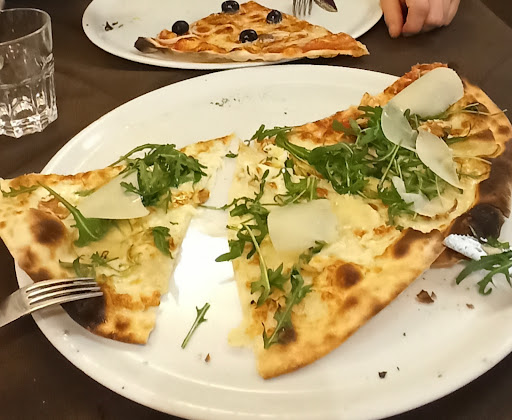 Non ci andate. Lo dico con tutto il cuore: Non ci andate. Dispiace dirlo, ma non sanno fare ristorazione. Arriviamo e ordiniamo. Sono le 21.00 quando parte la comanda: 2 pizze e le bevande. Locale non al completo. 2 cameriere in sala, una signora al forno a legna per le pizze e un signore in cucina che esce di tanto in tanto per i conti e i pagamenti. Stop. Nessun altro. La cameriera ci consiglia di prendere un antipasto, ci sarà da attendere un po' per le pizze. Mezz'ora? - chiedo io. Forse di più -mi fa la cameriera. Diciamo un'ora? - aggiungo. Ma no,non esageriamo - mi viene risposto. Alle 22.00, dopo un'ora di attesa, arrivano i 4 crostini che avevamo ordinato. Un'ora di attesa per 4 crostini. Alle 22.50 arrivano le pizze, dopo 110 minuti di attesa. Tempi da frecciarossa in giornate di sciopero nazionale. Questo lasso di tempo lo passo ad osservare l'organizzazione del locale. Le pizze vengono fatte uscire "neutre" dal forno a legna, poi la cameriera prende il piatto e le porta in cucina, dove saranno condite. Successivamente dalla cucina verranno riprese per essere portate in tavola. 4 persone per un locale da almeno 60 coperti, e così si pensa di gestirlo. Il clima in sala è triste, i clienti al tavolo si guardano sconsolati, e si finisce per scambiare due parole con i vicini di tavolo. Argomento? Beh, lo potete immaginare: l'attesa. E si finisce col riderci sopra. Ma è una risata amara. La pizza com'è? È una piadina. Non si può chiamare pizza una piadina. Sono due cose diverse. È come chiamare suv una dacia duster. Lo si può anche fare, ma poi tutti ti ridono dietro. Questa è una piadina. Nel senso che la signora al forno la stende col mattarello, ed alla fine ne esce una piadina. E gli ingredienti? Olive denocciolate sott'acqua, grana tagliato con l'affettatrice (e così si capisce quanto sia stagionato). In conclusione cosa aggiungere: ritengo che a chi ha il coraggio di aprire un'attività vada sempre fatto un applauso. Ma qui, forse, si è sbagliato settore merceologico. La ristorazione non può essere questo. Questo allontana le persone, e le spinge a restare a casa. Ma qualcosa di positivo ci sarà pur stato? Il vino sfuso della casa: gradevole. Ve lo dico di nuovo:...
