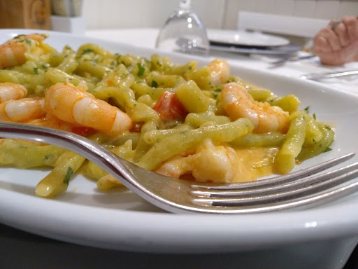 The evening started out pretty good, fast service with a good servant who helped out with English menus and ordering of the food and wine. First we ordered a plate of mussels which was good, after that I ordered the house special pasta (spagetti with seafood) - which was alright, but the shrimps didn't feel as fresh as the other restaurants in the area (osteria and romantagna I.e.) But then my partner got her order (grilled scampi)... 5 shrimps on a bed of salad leaves for 18 euro?! 5 shrimp? And they were dry, didn't taste fresh and had a very blend flavour. Total disappointment. And when we then asked for the bill, 10-15 minutes passed while we waited and saw our waiter run pass us to tend the other customers. Shape up!! This felt like a tourist trap in the...