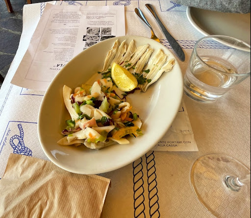 🇬🇧 Restaurant located along the canal of Cervia, in the center. It has very large rooms with many tables available, perhaps one of the few points in favor of the place. Unfortunately the kitchen is not the best. Overall, the appetizer was not bad, the seafood salad was good, the anchovies too. The mix of mussels (plain and alla sorrentina ) were not the best, many were "pulped". In the first few choices, the macaroni with fish sauce do not have an added value compared to how they would cook at home, good risotto but also not excellent one. The availability of two starters wouldn't have been a problem if they had both been very good. The expectations were high and from a restaurant like that, something more is expected. The service was a bit hasty as the dishes were taken away from us while we were still finishing eating. There is certainly room for improvement. It is a place with a lot of potential, but...