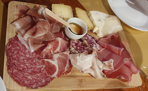 Nous avons pris une assiette de charcuterie et fromages à deux, deux plats de pâtes ( sauce 4 fromages et sauce arabiata)et deux fondants au chocolat.