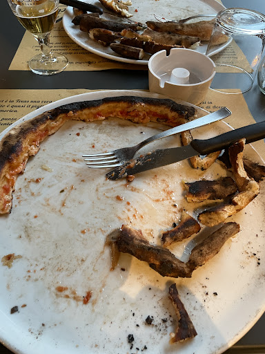 Appena mi hanno portato le pizze al tavolo ho notato subito che erano molto (forse troppo) bruciate. La ragazza di sala vedendomi perplesso (era dietro la vetrata che separava il mio tavolo dalla sala) mi ha chiesto se volevo che me la rifacessero. Ho risposto che mi dispiaceva buttarla e che avrei mangiato... il mangiabile. Almeno c'ho provato... ma era troppo amara. Metà bordo non era bruciato ma carbonizzato, così l'ho lasciato nel piatto. Anche la pizza di mia moglie era messa male, se non peggio (il fondo era sporco di polvere nera... tanto da lasciare l'impronta nel piatto, si nota anche dalla foto allegata).
