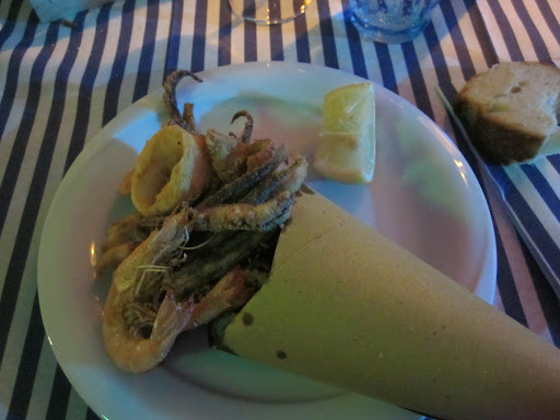 We ordered a bottle of White Wine for 11 Euros and two mains: a squid and potatoe stew and the famous mixed frittura (fried seafood and fish). The stew was really something different. The ingredients seem simple, but all is made fresh and the broth/sauce rich and flavorful. It's more than meets the eye. A great choice. The fried seafood was also a good choice. Fresh, hot and crispy calamari, shrimp and anchovies. Service was friendly and prices fair. Another good choice to have dinner in this...