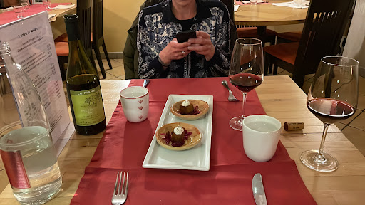 Abbiamo deciso di prendere Come antipasto: ragù di pecora te le servono con focaccia. Di primo abbiamo preso agnolotti al brasato molto buoni e tagliatelle fresce con asparagi tuorlo uovo e parmigiano ( dovrebbe essere il nome corretto del piatto) Di secondo abbiamo preso brasato di manzo uno servito con polenta e altro con erbette.