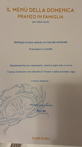 Venendo alla sostanza. Buffet per tutti i gusti, pesce: dal classico (seppie/ gamberi in saòr , sarde fritte) al contemporaneo (sushi, gamberi su pasta "kataifi") all'eccezionale crudo (dove trionfano scampi ed ostriche ). Carne: spiedini di carne scottata al momento, mini hamburger: semplici e gustosi. Tartare di ambo i generi. Burrata in crema, mozzarelle. Tradotto: nella nuova formula che prevede sempre più un aperitivo lungo e meno portate "al tavolo" il buffet è una delizia per il palato per gli occhi e per l'anima. Solitamente una volta seduti le portate sono 3. Delle ultime provate, che nell'eccellenza generale hanno ulteriormente spiccato, devo assolutamente menzionare la lasagnetta di molluschi e crostacei e gli gnocchetti al granso. Non che non meritino di essere citati tutti gli altri, sempre impeccabili sotto tutti gli aspetti: qualità ,presentazione, servizio. Insomma, a prescindere dal contesto: Tajer d'oro continua a garantire di sentirsi sempre a proprio agio ed oltremodo deliziati....