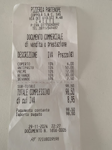 Partenope, nome scelto per l'origine della famiglia proprietaria del locale, si trova a Chieti in zona tricalle, in un posto ben servito e facilmente raggiungibile. Sapevo della sua rinomata pizza e di una certa maestria nella cucina del pesce e l'aspettativa non è stata delusa. Sono stata accolta con gentilezza, e la professionalità del personale mi ha accompagnato in modo costante e discreto durante la cena. Il menu è ben assortito ed equilibrato. Buona la scelta delle bevande. Le materie prime sono fresche e stagionali. Ho scelto di mangiare un antipasto, un primo e di assaggiare una pizza. Tutto ottimo, gli antipasti gourmet, i primi piatti abbondanti e i sapori definiti. Spettacolare la chitarrina allo scoglio. La pizza che ho scelto era bianca con funghi, rucola e parmigiano a scaglie davvero ottima. Il giovane chef Antonio è una promessa e vale la pena provare i suoi piatti, in cui sono manifesti entusiasmo e amore per il suo...