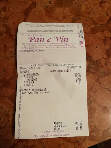 Pan e Vin è sempre una garanzia: è una pizzeria che esiste da tantissimo tempo e non delude mai! Le pizze sono davvero deliziose: vengono usati ingredienti di qualità e ci sono sempre delle pizze speciali preparate con i prodotti di stagione. Il menu offre una scelta molto ampia tanto che è impossibile non trovare qualcosa di proprio gusto. Anche i celiaci possono trovare delle ottime pizze e bruschette senza glutine. Per chi non volesse la pizza c'è anche la possibilità di mangiare altri tipi di pietanze come carne alla griglia, pasta, piatti tipici... non ho dubbi che sia tutto buonissimo ma personalmente non ho mai provato nulla dato che ho sempre preferito la pizza. L'ambiente è rustico e accogliente, disposto su due piani, con varie stanze a disposizione della clientela. Per chi ha bambini c'è una stanzetta apposita al piano superiore provvista di giochi e TV con cui i bimbi si possono intrattenere mentre i genitori mangiano tranquillamente al tavolo. I prezzi non sono particolarmente economici ma la qualità si paga e sicuramente ne vale la pena! Al pagamento del conto offrono sempre un bicchierino di liquirizia o limoncello... una piccola cortesia...