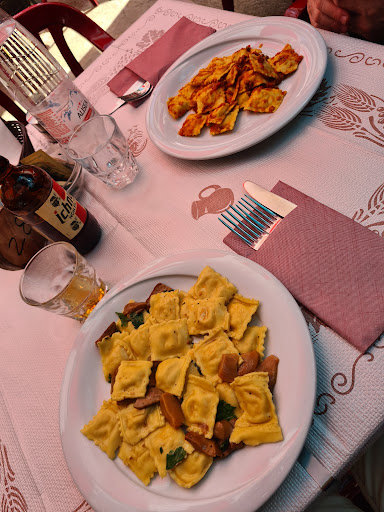Read moreIn gita con la moglie, dopo aver letto diverse recensioni positive, ho deciso di provare questo ristorante. La sera prima ho prenotato per la mezza, sono arrivato con dieci minuti di ritardo ma non mi hanno fatto nessun problema. Ci hanno messo in un tavolo esterno, sotto l'ombra di alcuni ombrelloni e delle piante, si stava benissimo, c'era anche un leggero venticello. Nonostante la delusione quando ci hanno portato il menù perché mancava il cinghiale, abbiamo preso un tagliere di formaggi e salumi, molto apprezzato vista la fame, un piatto di tagliatelle burro, salvia e noci e i loro famosi ravioli di patate ai porcini. Di secondo una bella bistecca di scottona da 500gr che abbiamo diviso, tenera e saporita e per finire una mousse al caffè con panna e dei cantucci con farina di castagne e vin santo buonissimi! Ho apprezzato moltissimo la gentilezza e la giovialità dei giovani camerieri: sempre con il sorriso in volto, ci hanno portato il doppio piatto per dividere la pietanza spontaneamente e soprattutto senza pause lunghe fra una portata e l'altra e sì che c'era molta gente! Conto nella norma per l'epoca e la qualità dei piatti molto elevata! Bravi tutti,...