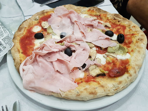 La qualità delle materie prime non era comunque alta; salumi affettati troppo spessi, burrata insapore, idem le creme (specie quella al pistacchio) e impasto un po' biscottato (quello ai cereali, quello rimasto alle 22.15...) Riporto una foto di una delle pizze condite "al volo" immaginiamo (anche l'occhio vorrebbe la sua parte)...