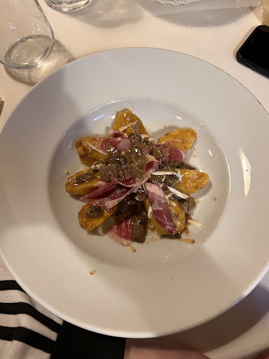 Abbiamo optato per l'antipasto misto "Solo Mattia", una generosa selezione di salumi misti, torta salata, crostini misti, sfogliatine e giardiniera di verdure. Per i primi, abbiamo assaporato gnocchi fatti in casa con ragù bianco di coniglio, tagliatelle di pasta d'uovo con ragù di salsiccia e radicchio rosso di Treviso, e gnocchi di zucca con funghi, petto d'oca e petali di ricotta affumicata del Cansiglio.
