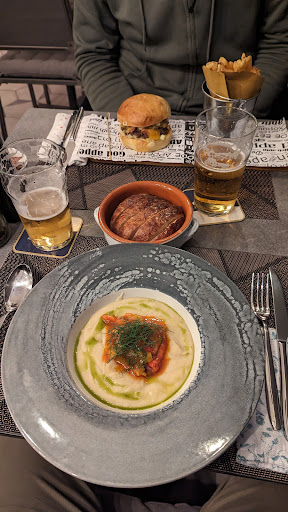 The hummus was creamy and well-seasoned, while the pulled pork crocchette were an absolute standout—crispy on the outside and tender on the inside. The terrina with smoked salmon and prawns was beautifully presented and incredibly fresh, adding a touch of elegance to our meal.