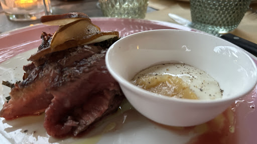 Nice restaurant near in an Agriturismo. We did not call ahead and we were lucky we could get a table. We sat outside on the terrace during a wonderfull evening. The restaurant is away from the crowded city and it is nice and quiet in the surroundings. We had tagliate di manzo in several different ways prepared (meat is red as it is supposed of course). As dolci, my partner had the cheesecake which is great and I had the biscotti with sanvino. We topped it off as always with an espresso. Prices are bit higher but still very reasonable. We will for sure go...