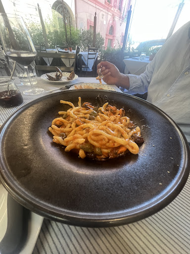 Abbiamo ordinato degli spaghetti alla chitarra con vongole e granella di pistacchi. Purtroppo le vongole erano vecchie! non tutte a dire la verità, qualcuna aveva anche un buon sapore ma la maggior parte erano letteralmente affogate con il vino e quando si metteva in bocca la vongola era quasi rancida.