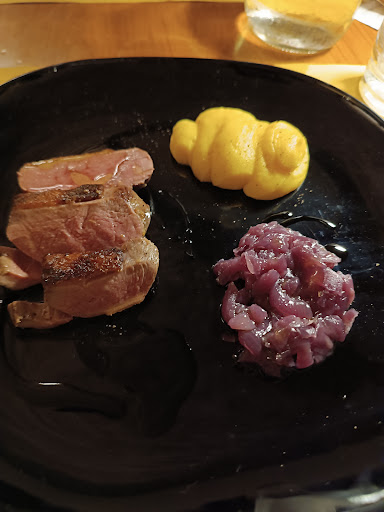 SERVIZIO SQUISITO Lo staff ci ha coinvolto senza essere invadenti con la loro gentilezza. Da notare che abbiamo gentilmente chiesto di dividere il secondo ( dalla foto per cui vedete mezza porzione ) di anatra e lo hanno impiatto direttamente diviso a metà! Una accortezza che quasi nessun ristorante fa! Questa è attenzione al cliente DOC!