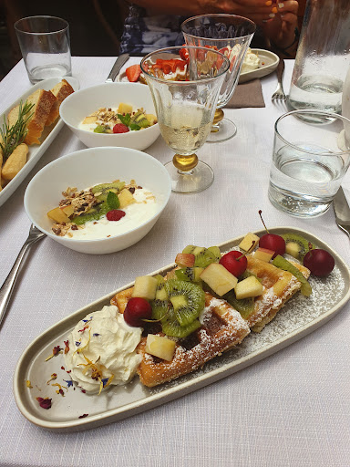 Brunch was SO delicious. If going for brunch you have to make a reservation and specifically request that you're reserving for brunch otherwise they'll give you a regular lunch menu. The menu is a set price of 25€ for a starter course and main entree, and they also brought a small bowl of yogurt with granola/fruit for each of us. I forgot to take a picture of our main entrees, but the starters were delicious. She got the pancakes and I got the waffles. Both were great but I thought the pancakes were better. For the main dish we each got the Avo Salmon toast with spinach & one poached egg - really tasty though I wish it had just a bit more sauce. Beautiful setting and atmosphere!...