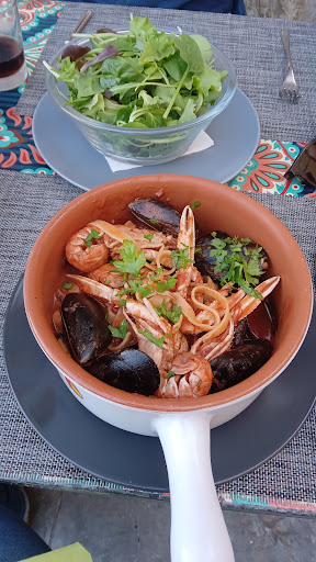 Read moreEs ist so schade... Wir gehen seid 6 Jahren jeden Sommer dort essen. Es war anfangs hier in der Gegend mit die beste Pizza und das geschmackvollste Essen. Es hat im Laufe der letzten 2 Jahre leider so sehr nachgelassen. Vor ein paar Jahren gab es noch tolle Gerichte aus der Region auf und Tagesempfehlungen. Jetzt ist die Karte eher auf Touris minimiert worden. Das Preis/Leistungs - VerhĂ€ltnis stimmt leider nicht mehr. Mein Mann und ich hatten Pasta... War geschmacklich ok, aber die Portionen waren sehr ĂŒberschaubar. Leider waren beide Gerichte nur lauwarm. Unsere Vorspeise wurde zum Hauptgang mit serviert (na ja, kann passieren). Die Pizza unserer Tochter war sehr enttĂ€uschend.. War von der GröĂe eher eine kleinen Kinderpizza. Schon letztes Jahr Ă€hnelte die Pizza die der typischen aus Neapel (sehr dicker Rand), aber da war sie noch normal groĂ.... aber jetzt. đ Der Bereich fĂŒr den Belag war gerade mal so groĂ wie 2 HĂ€nde nebeneinander geschlossen. Achtet auf die Pizza im Foto und daneben die Hand meiner Tochter (12 Jahre) so könnt ihr die groĂe erahnen.. peinlich klein. Meine Tochter war sehr enttĂ€uscht.... Der Rand war leicht verbrannt (ok, nicht schlimm) und in der Mitte war der Teig zwar dĂŒnn, aber absolut nicht durch. Auch ihre Pizza war lauwarm. Wir hatten das GefĂŒhl, dass die MeeresfrĂŒchte auf die Pizza nachtrĂ€glich fertig gegart darauf gelegt wurden und nicht mitgebacken. Anbei findet ihr ein Bild, aber es sieht besser aus, als es leider war. Auch anhand von dem Besteck, neben den Tellern kann man erahnen wie bescheiden die Portionen der Speisen waren.