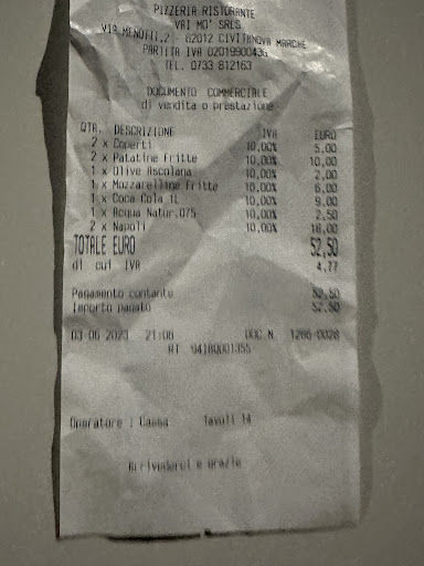 Read moreho prenotato un tavolo il 18.08.2022 per le ore 20.30 fino qui tutto regolare, eravamo 4 persone ci siamo seduti in perfetto orario , abbiamo aspettato 20 minuti per l'arrivo di un cameriere , successivamente ha preso le ordinazioni. Nel frattempo la cameriera ha portato 2 bottiglie d'acqua ed una birra media, senza portare come si fa in altri ristoranti né pane, né grissini (per ingannare l'attesa). Abbiamo ordinato una frittura di pesce, una pizza Margherita, un tagliere di formaggi e salumi, ed infine cotolette di pollo con patate fritte.(SPECIFICO COTOLETTE COME SCRITTO SUL MENU'). Alle 21.25 (dopo 40 minuti di attesa )arriva la pizza Margherita, dopo altri 10 minuti UNA COTOLETTA DI POLLO (SARA' STATA 80 GRAMMI CHE SUL MENU' SPECIFICAVA COTOLETTE!!!!) CON UNA MANCIATA DI PATATE FRITTE, SENZA PORTARE IL PANE (HO DOVUTO CHIEDERLO MA NON PORTATO SUBITO!) POI DOPO 10 MINUTI ....IL TAGLIERE COME SPECIFICATO SOPRA ,CONTENEVA UNA FETTA DI SALAME TIPO MILANO, UNA FETTA DI SALAME MARCHIGIANO,DUE TRIANGOLINI DI FORMAGGIO CACIOTTA DOLCE, E DUE TRIANGOLINI DI FORMAGGIO CON PEPERONCINO, TRE FETTE DI PROSCIUTTO MOOOLTO TRASPARENTI, UNA FETTA DI LONZINO, DUE MOZZARELLINE IN PASTELLA QUESTO IL TAGLIERE DI SALUMI E FORMAGGI!!!!! INFINE LA FRITTURA DI PESCE DEVO DIRE UNA QUANTITA' GIUSTA. IL PREZZO PAGATO € 73,50 PER UN TOTALE A PERSONA DI € 18,375, PER AVER MANGIATO COSAAA??? PER AVER TERMINATO ALLE 22.15 CIRCA. SPECIFICO SONO DEL POSTO NON UN TURISTA. NON...