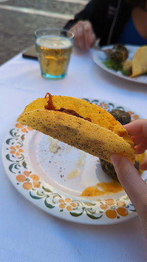 Read moreThe place is lovely, I loved the decorations, the ambience, it's fun and cosy. They have vegan options, and that was amazing. We wanted to share a starter and a main course, so we ordered the vegan tacos, which is a starter, and we got two tiny tacos with a crispy supermarket tortilla, more like a toast, with some cold eggplant inside. It was tasty but overpriced (I'm showing one of the tacos in the picture they were 10 euro). We also ordered the vegan meatballs as a main dish, we only got 3 spinach meatballs with some pumpkin sauce, it was very small for a main dish and 14 euros! The food took a while so we didn't order anything else, the prices also seemed a bit expensive for the amount of food you get. The ginger, cucumber and green apple juice was delicious, but again, it came in a very small glass and for 7 euro you expect something bigger. We had to go somewhere else afterwards to eat some more cause we were still hungry.. The food was tasty but the portions...