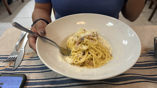 Read moreAvete presente il format "cucine da incubo"? Quallo con lo chef Cannavacciulo che va in giro per risollevare i ristoranti? Ecco, se sapete di cosa sto parlando vi comunico che questo ristorante si candida a pieno titolo per una puntata. Ristoranti tutti pieni ma riesco a trovare questo ancora prenotabile, il dubbio mi viene già qui, ma prenoto. Arriviamo al ristorante e il titolare velocemente viene a prendere le ordinazioni. Partiamo con la pasta per il bambino, mezza porzione di penne al pomodoro, per noi 3 adulti un antipasto e 3 primi. Per il secondo volevamo attendere un attimo ma no, il proprietario ci ha fatto presente che dovevamo sceglierlo subito perché poi non avrebbero potuto gestire l'ordine 🙉, ok dunque, ordiniamo anche una frittura e un'orata al forno. Arriva l'antipasto 🙈 un tagliere da dividere di salumi e formaggi. Non credevamo ai nostri occhi, il prosciutto era grigio. Abbiamo rimandato indietro tutto il tagliere, lo hanno ripreso indietro dicendo che il colore era dovuto dal fatto che il prosciutto era tagliato "da prima". Dico io, scherziamo? Quel prosciutto era proprio vecchio!!! Palesemente vecchio e pure di pessima qualità, con il sale sulla fetta! Tagliolini alle vongole con poco gusto, paccheri polpo e guanciale buoni. Frittura ok ed anche l'orata, cotta bene e succosa...però mio marito è allergico al kiwi. Cosa ti trovo nella fiamminga dell'orata? Una bella macedonia di frutta allergizzante come kiwi e fragole 😑 Non abbiamo preso il caffè. Non abbiamo preso il dolce. Siamo scappati in buona sostanza, ma non prima di pagare un ingiustificatamente salato conto 🙉 ricordate la mezza porzione di pennette al pomodoro per il bambino? 10 euro. Hanno tolto dal conto l'infame tagliere, ma 40 euro a persona per quello che abbiamo mangiato non ci stanno proprio. Inoltre, sul menù l'orata costava 30 euro, sul conto 35 euro. Consiglio di scrivere sul menù il prezzo all'etto, così che cambi a seconda della pezzatura dell'orata. Avremmo fatto meglio a mangiare al mcdonald's sotto...