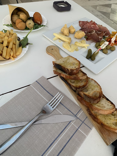 Read moreCon il cambio gestione ... MA ANCHE NO !!! La foto dice tutto, andiamo in ordine: Tagliere Maxi ( posso immaginare il Tagliere normale come possa essere ) che è quello nel piatto quadrato. 2 fette di prosciutto, 2 fette di lonza, 2 fette di salame, 4 pezzetti di formaggio, 3 pallette di pasta di pizza, olive in salamoia proprio No, Cetriolini in agrodolce proprio No, peperoni quasi crudi + 6 pezzetti di pane bruscato. A parte fritti misti, 2 cartocci di cui uno solo patatine fritte e l'altro con 1 supplì, 2 olive ascolane, 5 pallette di frittelle alle alghe. N.2 Spritz portati 25 minuti prima delle cose da mangiare con 30°C immaginate insieme ai pasti che cosa ho bevuto ... Il tutto per un valore di 39€ ... sinceramente me li vado a mangiare in...