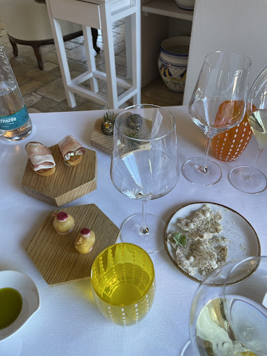 Read moreArrivati grazie al navigatore (le indicazioni sono rimesse alla cartellonistica stradale standard), veniamo accolti dal personale di sala che ci accompagna al nostro tavolo che sarà uno dei punti deboli della nostra esperienza. Veniamo infatti collocati in una sala allestita per una comitiva, in un angolino tutto sommato carino. Scegliamo il menù "Campagna" da 85 euro con abbinamento di vini (regionali e extra regionali) da 45 euro. Alla prima portata il personale di sala pasticcia un po': il cameriere, mentre ci serve la portata, viene interrotto dalla collega addetta al servizio del vino e rispedito in cucina. Pagherà l'interruzione con una palese indecisione nella presentazione dei piatti della prima portata. I piatti sono tutti buoni anche se ci saremmo aspettati qualcosa in più, data la stella che campeggia all'ingresso. La nota stonata è sicuramente l'abbinamento di vini, non volendo con questo intendere l'accostamento ai piatti, quanto invece la qualità degli stessi che risultano pressoché "commerciali". Tra questi spicca in negativo un rosato "Torre dei Beati" che viene scartato nella prima bottiglia dal Somelier (che ci dice "la bottiglia ci ha fatto uno scherzetto") salvo poi servirci la seconda dalla qualità pressoché discutibile (forte odore di zolfo) giustificato dal Somelier come caratteristica della dinamicità del vino nel tempo (male male) quando abbiamo restituito i bicchieri quasi pieni.