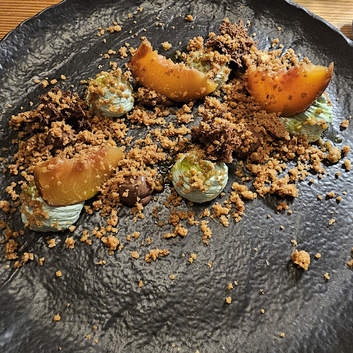 Piccione allo spiedo con salsa di mandorla, ketchup di susine e battuto di susine, mandorle ed aneto (cosce del piccione servite a parte a doppia cottura).