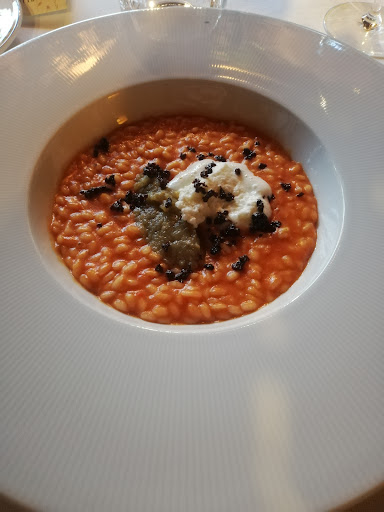 Ho preso una battuta di salmerino agli agrumi e pepe di timut con capperi all'olio e chips di riso (tutti sapori ben bilanciati che non hanno coperto il protagonista del piatto, ovvero il pesce) seguito dal riso con crema di pomodoro, spuma di bufala, olive taggiasche e caviale di melanzane (piatto rischioso perché il riso al pomodoro tende a stancarmi molto facilmente, in questo caso invece l'ho gustato fino alla fine grazie agli altri sapori) e infine le sfere di meringa alle more di gelso (buona e asciutta la meringa, buono il gelato al suo interno ma direi sorprendente il gelso, un sapore netto e molto particolare, che comunque si abbina bene al resto del piatto). Insieme al caffè viene servita della petite patisserie, non mi ha fatto impazzire ma considerando tutto il resto non ne ho risentito.