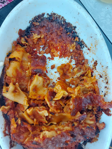 Extrem enttäuscht wurden wir von der Lasagne. Hier ist ein Punkt schon zu viel. Diese war absolut trocken und angebrannt, oben, seitlich und unten. Der Teich hatte so eine mürbe/weiche Konsistenz, als ob diese Lasagne schon vorgebacken war und dann für den Gast nochmal aufgewärmt wurde. Keine Spur von der Sousse. Geschmacklich auch schlecht, kaum gewürzt.