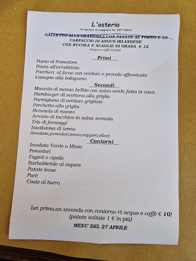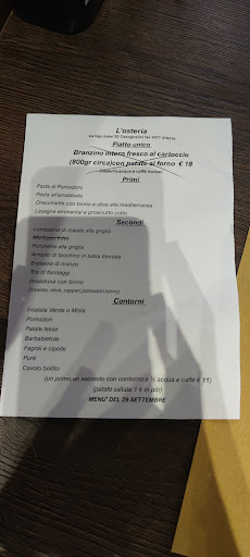 Esperienza da 5 stelle sotto ogni profilo, capitati quasi per caso in questa che di nome e di fatto è la classica osteria dei film di una volta. Ambiente caldo, ricco di tavoli rigorosamente in legno e camerieri stra premurosi, era pranzo e c’era il menù completo a 11€. Di questi tempi quando vedi un menu completo a un prezzo basso storci quasi il naso, pensi alla bassa qualità o al servizio scadente e invece .. partendo dal pane, fresco, di giornata e di forno non roba surgelata da iper mercato, ti rendi subito conto che qui non sbagli a sederti. Primi piatti semplici, ottimi, e direi in buona quantità . Io ho preso una pasta all arrabbiata veramente deliziosa e .. molto arrabbiata come piace a chi prende cibi piccanti. Ho desistito sui secondi prendendo un po’ di bresaola (tagliata al momento,si sentiva eccome) e un contorno di fagioli e cipolle ma ci sarebbe stata polenta con gulagh, bistecche e molto altro. La mia compagna idem, un primo e un contorno di tutto rispetto, pasta al sugo (ottima) e patate saltate (divine) . Pure il caffè, che in genere nei ristoranti fa pietà , era ottimo. Il tutto in un contesto caoticamente favoloso per chi ama il genere osteria , appunto, con molto riguardo però all accoglienza e alla gentilezza da parte dei gestori e dei camerieri. Insomma, altro che pranzo di lavoro, ci tornerò sicuramente la sera per provare il menu alla carta, da quel che intendo ricco di specialità della zona. Bravi bravi bravi, se poi considerate che siamo usciti soddisfatti e felici pagando solo 20€… nel 2025.. non aggiungo...