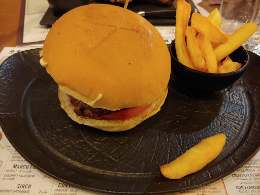 Read moreLocale per chi ama la carne con combinazioni diverse.. con salse, piccante, cruda... Possibilità di scelta tra pizza, primi, secondi a base di carne. La prima volta ho mangiato la pizza San Daniele.. buonissima, la pasta rimane fragrante e non "appassisce" da subito. Non mi ha fatto sensazione di sete dopo averla mangiata; segno che la pasta è ben lievitata. Mentre la seconda volta che sono stato, ho preso polletto allo spiedo piccante con patate e salsa. Il top! Carne morbida, succosa e non stopposa rosolata al punto giusto...Da leccarsi le dita. Le patate per tutta la cena sono rimaste croccanti fino all'ultima. Molto leggere e non unte.. La porzione in generale è abbondante con la sicurezza di uscire dal locale sazi ma senza il senso di pesantezza.. Il cibo caratteristico del locale punta su molte varietà di Hamburger e varietà di carni e tramezzini.. I vini in bottiglia sono molto corposi e buoni e marchi rinomati come Felluga.. insomma tra mangiare e buon vino il palato gode 🤩 I prezzi solo leggermente "alti" rispetto alla media, ma premetto che la qualità va pagata e qualche euro in più lo lascio volentieri (pure la mancia) Il locale si presenta accogliente, molto tranquillo con tavoli interrni al locale ed esterni con giardino estivo... il personale gentile e sempre a disposizione! Se volete passare una serata tra amici con buon cibo, questo è il locale adatto! P.s. per certe pietanze, come il pollo allo spiedo, il tempo di attesa è poco meno di 30 minuti circa...ma non lo considero un...