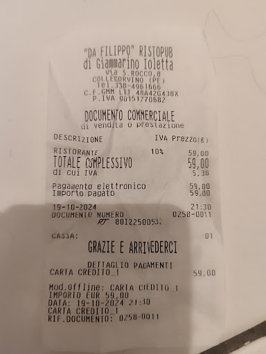 Read moreBhe che dire.... Sono stato "truffato" sono andato a mangiare in questo ristorante in (2) che non servono i menù. Dov'è ho preso antipasti caldi e freddi 15 arrosticini 3 lattine di coca cola è una porzione di patatine fritte. Ho speso la bellezza di 59€(non so come sono arrivati a quella cifra). Mai più sconsiglio se questi sono i prezzi Ho visto alle altre recensioni dov'è c'è scritto "qualità prezzo" ma per me non è stato così. Rispondo: 28€ di antipasti? 2 fette di prosciutto,lonza salame e formaggio pomodori secchi e ricotta. Poi 1 parmigiana, 2 pallotte. 28€? Se non essere...
