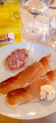 Read moreCi siamo stati domenica a pranzo con amici. Abbiamo prenotato la mattina stessa, affidandoci alle recensioni. Chi ha risposto al telefono è stata di una gentilezza fuori del comune di questo periodo. Il locale è carino, abbastanza pieno di gente. Arrivati ci hanno controllato Green pass e fatto accomodare al tavolo. Il menù ci è stato proposto da una cameriera, fra una scelta di primi e secondi, ci ha consigliato per un bis. Nell'attesa ci è stato offerto un antipasto, molto gradito. I primi, gnocchi caserecci con ragù di vitello e linguine con musso ottimi, un po secca la lasagna. Fra i secondi, molto gustosa la scaloppina ai funghi, buona l'anatra, i formaggi niente di particolare magari un po più di scelta. Diciamo che nell'insieme si è mangiato bene, non troppo apprezzati i contorni cotti e le patatine che sembrano riscaldate. Ci siamo consolati con i dolci. Il servizio è stato scorrevole, senza lunghe attese. Personale gentile e attento. Con i caffè, è arrivato anche un piccolo pensiero per le donne del tavolo in occasione della loro festa imminente, molto apprezzato. Posto pulito dove si mangia bene, senza particolari esigenze, ospitalità, e prezzi nella norma. Possibilità di una piacevole passeggiata nelle vicinanze, forse anche un pochino impegnativa,...