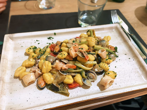Read moreOrdinato una tagliolini gamberi e zucchine, arrivati con pomodorini e formaggio tipo parmigiano amalgamati , premetto che odio oltre ad essere allergica, il parmigiano sulle minestre, a meno che non siano dei piatti dove si mette come ingrediente, l'ho rimandata indietro. Avevamo chiesto di farli "marciare" assieme alla comanda del mio compagno dato che lui prima, aveva ordinato come antipasto dei crostini di baccalà mantecato a base di polenta, i quali di baccalà non avevano nulla, si sgretolava e sopra come guarnizione c'era della cipolla rossa che copriva il tutto. Ho visto il titolare condire sul banco del bar un piatto con formaggio grana grattugiato già pronto tolto da una busta, dopo che era stato richiesto il formaggio da un altro cliente, invece di portare la formaggera al tavolo. Scarsa attenzione ai prodotti, e scarsa attenzione al cliente, specialmente se originario della patria del baccalà mantecato e del pesce Abbiamo sgamato questo brutto modo di trattare i clienti. E parlo da persona che ha sempre lavorato nella migliore ristorazione e hotellerie di Venezia. Abbiamo pagato l'antipasto e le 2 birre in bottiglia, nonostante ci fosse la spina della birra moretti che io avevo chiesto. Un consiglio, se vi faccio sospendere l'ordine e vi rimando indietro il piatto, non mi auguri, che sia per voi un bel pomeriggio..., perchè senza gli avventori non esistereste. P.S = sono una local guide magnanima e non la prendo mai sul personale, quindi la mia è una recensione...