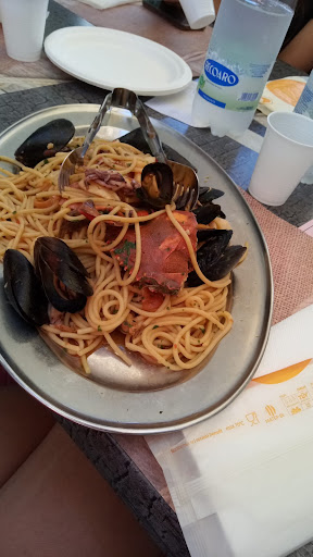 Le porzioni sono super abbondanti, un menù da 14€ può benissimo sfamare due adulti medi. Il menù comprende un piatto di spaghetti alle vongole che saranno due etti abbondanti e un fritto con patate generoso + vino. Da sottolineare il fatto che se anche sotto pressione ,a causa delle tante persone, siano stati veloci senza dimenticarsi nulla o attese. Non avevamo prenotato. Da non sottovalutare il fatto strano della mancanza delle zanzare, in altri luoghi che vendono le stesse pietanze ,solitamente, sono invase dalle zanzare perché in prossimità di zone verdi o acqua. Non c'è servizio al tavolo ma forniscono tovaglietta , posate , bicchieri, da riportare alla fine. Chiamano tramite casse acustiche poste anche...