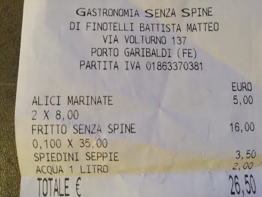 Read moreSono stato oggi in questa friggitoria, una delle tante a Porto Garibaldi, abbiamo preso due fritti di calamari e gamberi a 8.00 euro cadauno per 200 grammi di prodotto, uno spiedino con 2 seppie impanate del peso totale di 100 grammi, erano solamente ripiene di pangrattato per fare peso, poco cotte e senza sapore, al prezzo di 3.50 euro per un etto di prodotto. Ma la cosa che ci ha fatto arrabbiare e portarci a fare una recensione di questo tipo è la cifra per le alici (sul menù esposto lo chiamano "antipasto") della quantità' di 5 filettini di alici messe sul piatto a forma di stella e vendute a 5 euro. INACCETTABILE. Sconsigliato al 100%. E' la peggiore esperienza di friggitoria su 10 attività che abbiamo provato da vari anni a...