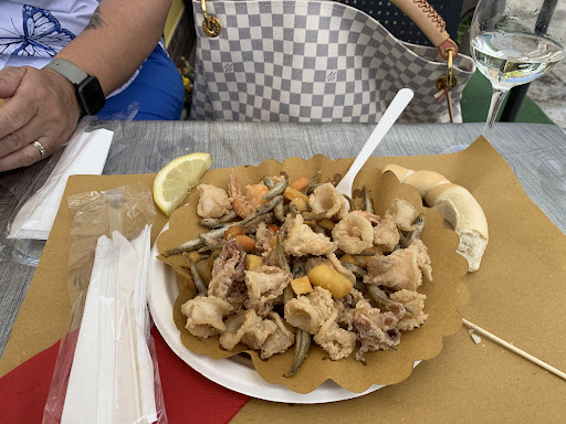 Read moreMia moglie ed io eravamo a passeggio per Comacchio. Non avevamo programmato né la gita a Comacchio né tanto meno la cena. Ad un certo, punto proprio dinanzi al ponte dei Trepponti, il profumo del pesce fritto servito al cartoccio, famiglie con tanti bimbi che giocavano dinanzi al locale, il sole che tramontava, ci hanno invitato a fermarci in questo posto molto sereno, e a cenare con una "barchetta" di pesce fritto e un gin tonic preparato con la loro tipica salicornia. Ci siamo trovati bene, a mangiare all'aperto su quei tavolini in modo così familiare e poco formale. Il prezzo di questa cena-aperitivo non mi sembra proprio economico, ma del resto lo si fa "una tantum" come eccezione e non come abitudine, in un posto bellissimo e caratteristico unico al mondo. È la prima volta in vita mia che vedo Comacchio. Servizio molto gentile, sorridente e alla mano, collocazione bellissima, direi strategica, e cibo consumato...