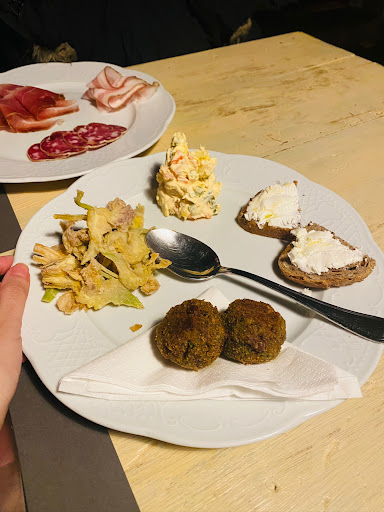 Read moreLocale accogliente e ben curato nei minimi dettagli. Sapore di antico nelle mura, sul pavimento di maioliche antiche e nel legno delle travi: il tutto riscaldato da un pregiato camino, principe della sala. Proprietario impeccabile per professionalità e competenza, capace di gestire la sala e di accompagnare gli ospiti lungo un percorso culinario fatto di antichi sapori. Antipasto abbondante e gustoso: salumi di prima scelta, carciofi arrostiti, insalata russa (dal sapore sopraffino), melanzane tagliate a listarelle e fritte in padella e,per finire, uova al tegamino accompagnate da asparagi sbollentati. A seguire, abbiamo assaggiato un primo speciale: piatto di origine veneziane (del quale non ricordo il nome) fatto con una sorta di spaghetti, uvetta, pinoli,cipolle ed acciughe. Come secondo abbiamo assaggiato del baccalà alla vicentina, un filetto di scottona al pepe verde e costata di scottona (9 etti, sufficiente per due persone). Infine, un tiramisù ed una pastiera di ottima manifattura. Il tutto accompagnato da un raffinato prosecco, seguito da un bianco della lombardia ed un mezzo rosso san giovese. Nulla da eccepire...se non fosse per il totale!Peccato. I prezzi ci sono sembrati, in generale, leggermente sopra la media ma un antipasto 20 euro a testa va, a nostro avviso, un po' oltre. Certamente lo consigliamo e noi stessi ci torneremo ma una revisione delle tariffe risulta necessaria nell'ottica di un adeguamento del rapporto...