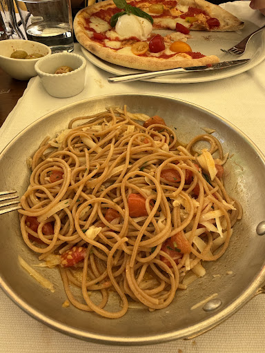Our waiter was straight up rude. He didn’t care about anything, took our order loosely, and asked me three times what pasta I wanted even though I clearly said it three times. He wouldn’t even make eye contact with us, just glared out into the street looking for people or staring at passersby instead of paying attention to his only guests. The appetizer arrived, and it was awful: bruschetta served on stale, untoasted bread with diced tomatoes and olive oil simply thrown on top. Still, we decided to give the place a chance.