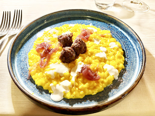 Abbiamo ordinato à la carte, sperimentando piatti diversi per assaporare un'esperienza a tutto tondo: tra gli antipasti abbiamo optato per una tartare di cervo, servita con una saporita guarnizione di gocce di datteri, barbabietola e zincarlin, come primi abbiamo prediletto il delizioso risotto carnaroli riserva San Massimo allo zafferano con burreola di pecora brianzola (Presidio Slow Food), Caprino di Caslino e cipolla caramellata al Sassella, un'esplosione di gusto e sapori che ci hanno cullato verso i secondi, dove abbiamo assaggiato sia la guancia di manzo al vino rosso con soffice di patata e scaglie di cioccolato che gli spiedoni di carpaccio di manzo e lardo, entrambi piatti deliziosi. A finire ci siamo concessi un autentico peccato di gola: la Crema del Crotto, una base di gelato alla crema con un fondo di mandorle tostate, polvere di caffé e spuma di mascarpone brûlé.