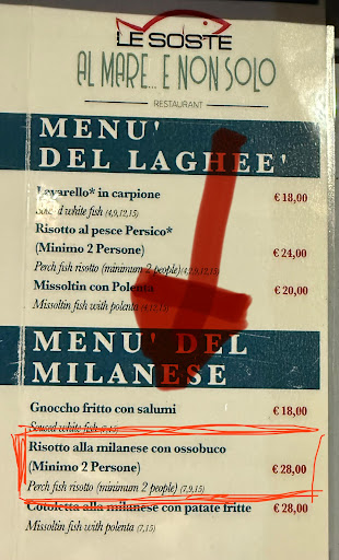 Unmöglich!! Leckeres Essen, angemessene Preise, ganz nett gestaltetes Lokal- allerdings ist das Verhalten des Inhabers völlig inakzeptabel!! Wir waren mit Freunden und unseren beiden Kindern im „Le Soste Al Mare E Non Solo“ und wollten dort einen gemütlichen Abend verbringen- bestellt wurden Pasta und Fischgerichte. Als nicht Fischesserin lachte mich das Risotto Milanese mit Ossobuco an- gestolpert bin ich dann aber über die englische Übersetzung, bei der „Fischrisotto“ und „ab 2 Personen bestellbar“ stand. Ich nahm zwar an, dass sich da vermutlich ein Fehler eingeschlichen hatte, wollte aber keine böse Überraschung erleben, indem es womöglich in dem Fischlokal eventuell eine abgewandelte Form des Klassikers geben könnte und fragte bei der Bestellung nach. „Beim Risotto Milanese ist kein Fisch dabei, richtig?“ „Nein, natürlich nicht!“ dann erlaubte ich ihn auf den Fehler in der Karte hinzuweisen- anstatt dies dankbar anzunehmen, wurde ich äußerst unfreundlich und genervt unterbrochen- ob ich das Risotto denn nun bestellen wolle oder nicht… ja, bitte… „eine Portion oder zwei?“ Ich wunderte mich etwas, da es laut Karte ja ein Gericht für mindestens 2 Personen sein sollte… auf meine überraschte Rückfrage, ob das auch möglich sei, wurde ich wiederum genervt unterbrochen und schnaufend wurde ein knappes „Ja, natürlich!“ erwidert! Alle am Tisch waren sehr irritiert. Mein (zugegebenermaßen sehr leckeres Gericht) kam als letztes- als sogar die Kinder schon längst mit dem Essen fertig waren. Selbstverständlich ohne irgendeine Begründung, geschweige denn Entschuldig… So geht man NICHT...